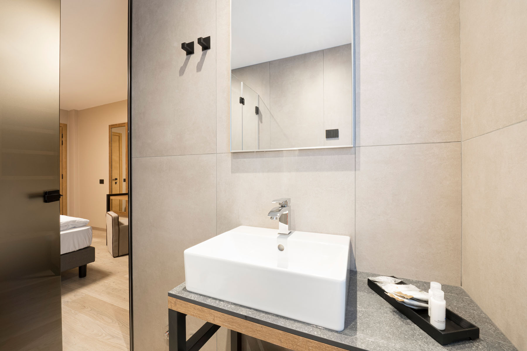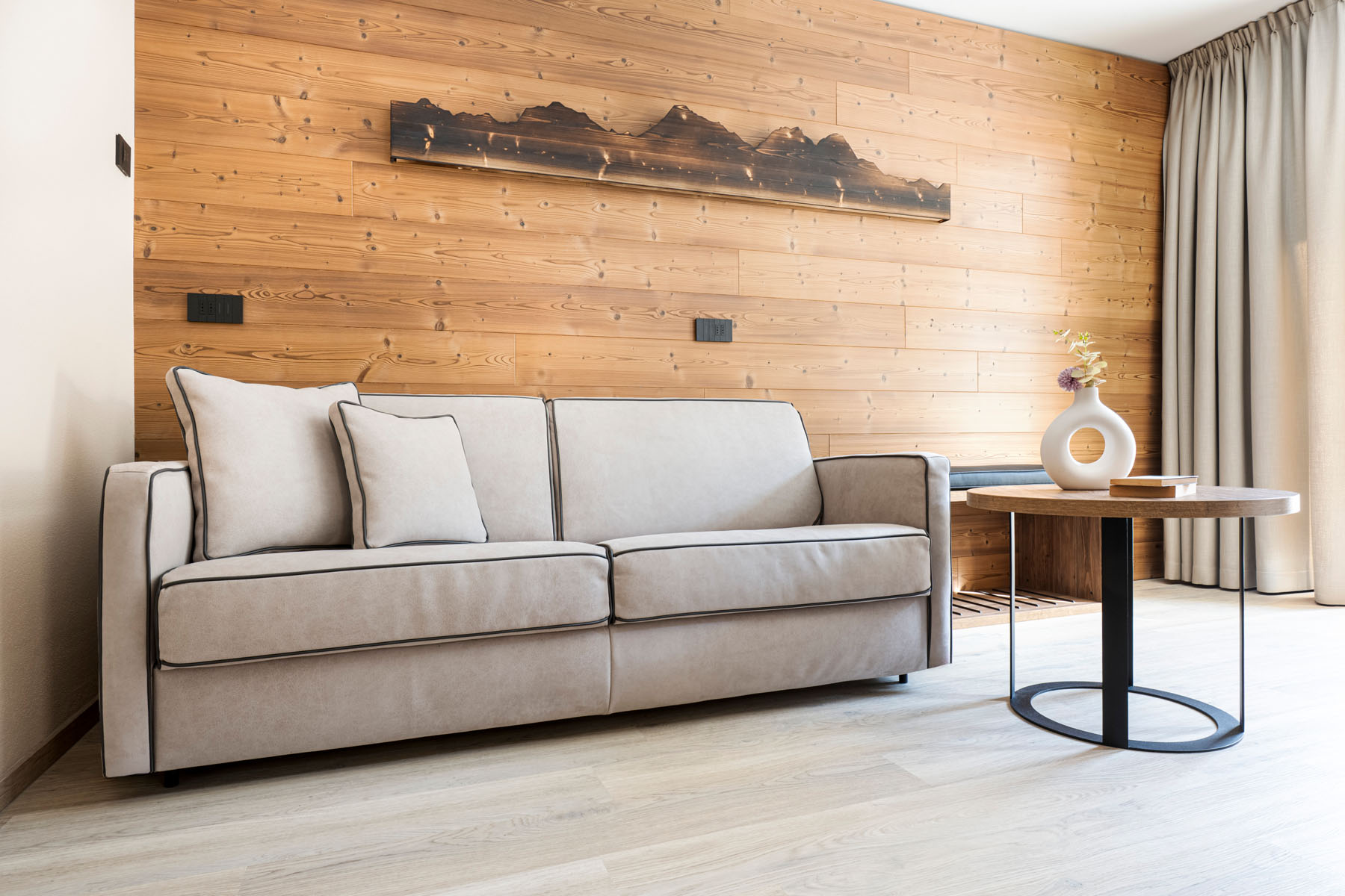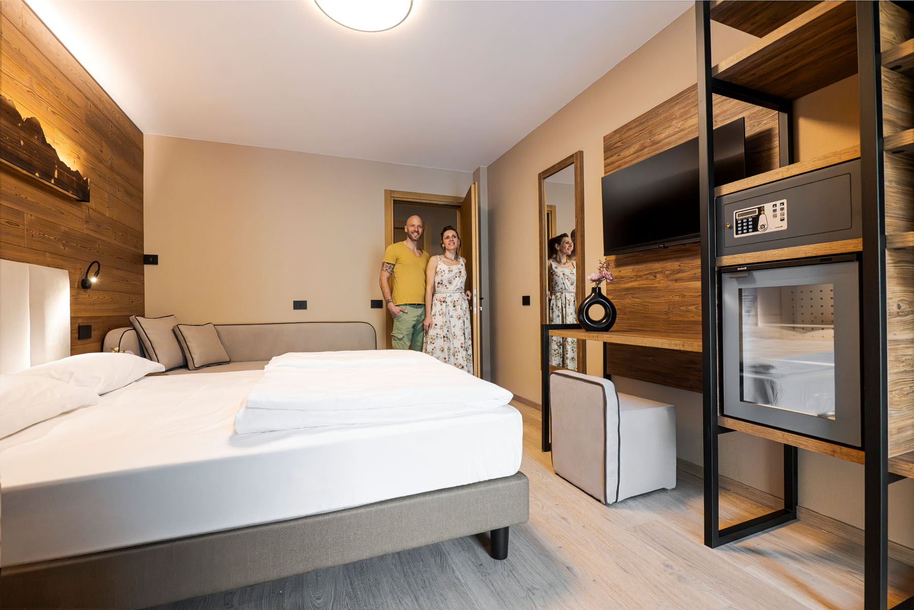 Completa la rinnovata offerta la confortevole Junior Suite che può ospitare fino a 4 persone, grazie al piccolo salotto con divano letto matrimoniale. Spazioso il box doccia, due i balconi con vista sulle splendide montagne vigezzine, due schermi tv (32 e 40 pollici), frigobar e cassaforte con prese di ricarica USB.